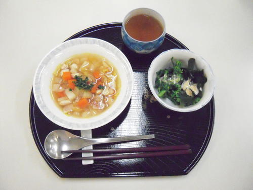 鶏ささみ(30グラム)、ベーコン(5グラム)、かぶ(30グラム)、にんじん(15グラム)、キャベツ(15グラム)、玉ねぎ(15グラム)、オリーブ油(小さじ2分の1)、うどん(乾)(5グラム)、パセリ(みじん切り)(小さじ1)、鶏がらスープの素(小さじ2分の1)、水(160cc、蒸発分含む)、しょうゆ(小さじ2分の1)、みりん小さじ(3分の1)