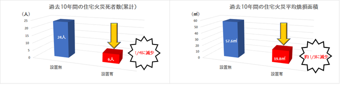 - 平成24年から令和3年までの10年間において、本市における住宅火災による平均死者数は「設置あり」の場合は「設置なし」と比較して4分の1に減少しています。