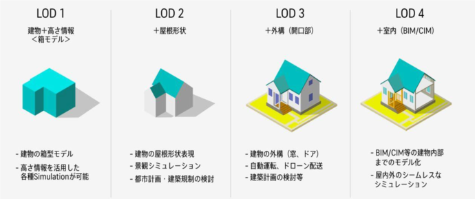3D都市モデルの詳細度は、LOD1から4の種類があります。