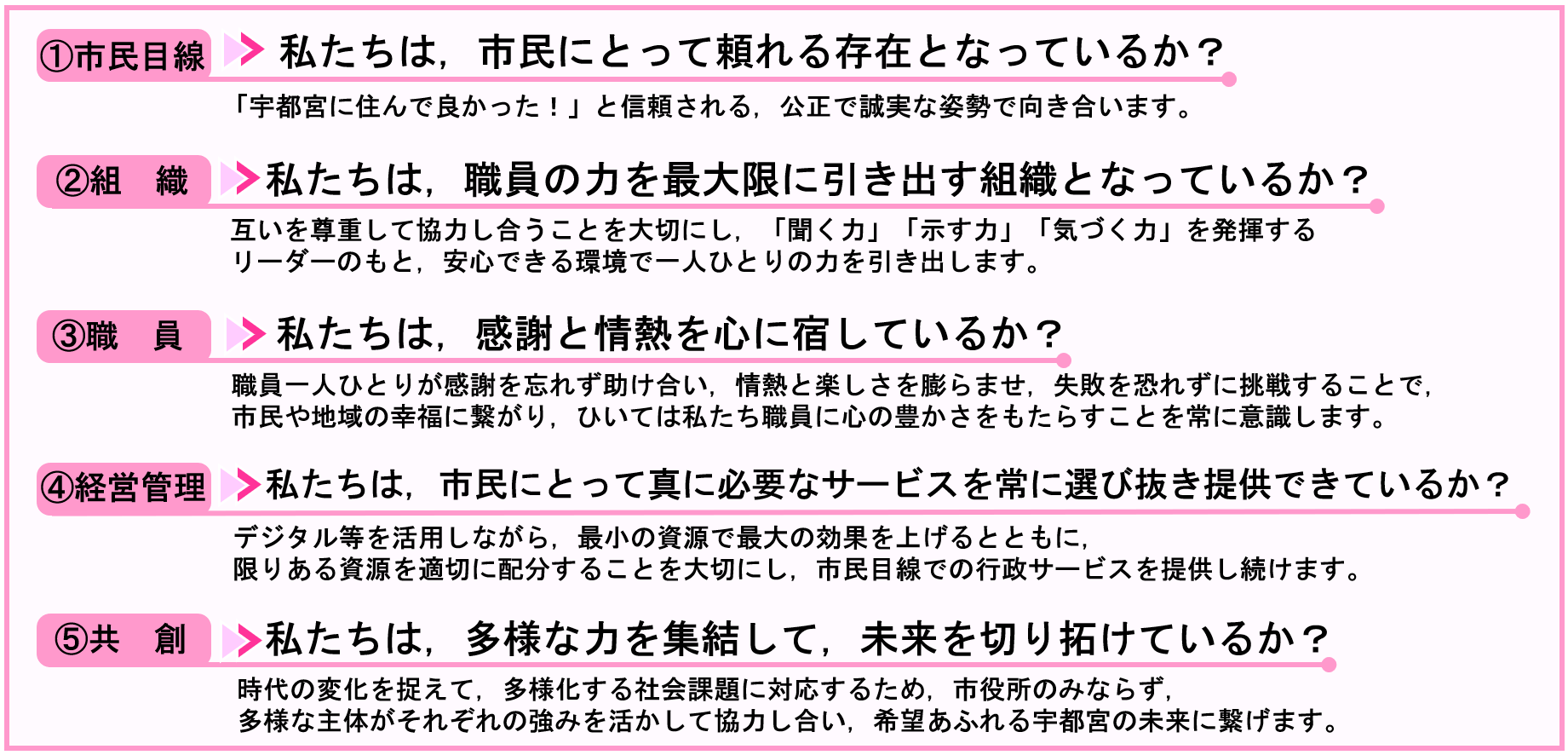 そのためには、本市の総合計画が示す都市像に加え、宇都宮市役所という組織そのものが果たすべき使命や存在意義などを言語化し浸透させることが必要であることから、市長を含め、若手職員から管理職職員まで幅広く想いや意見を聞き取った内容を踏まえてMVVを策定しました。